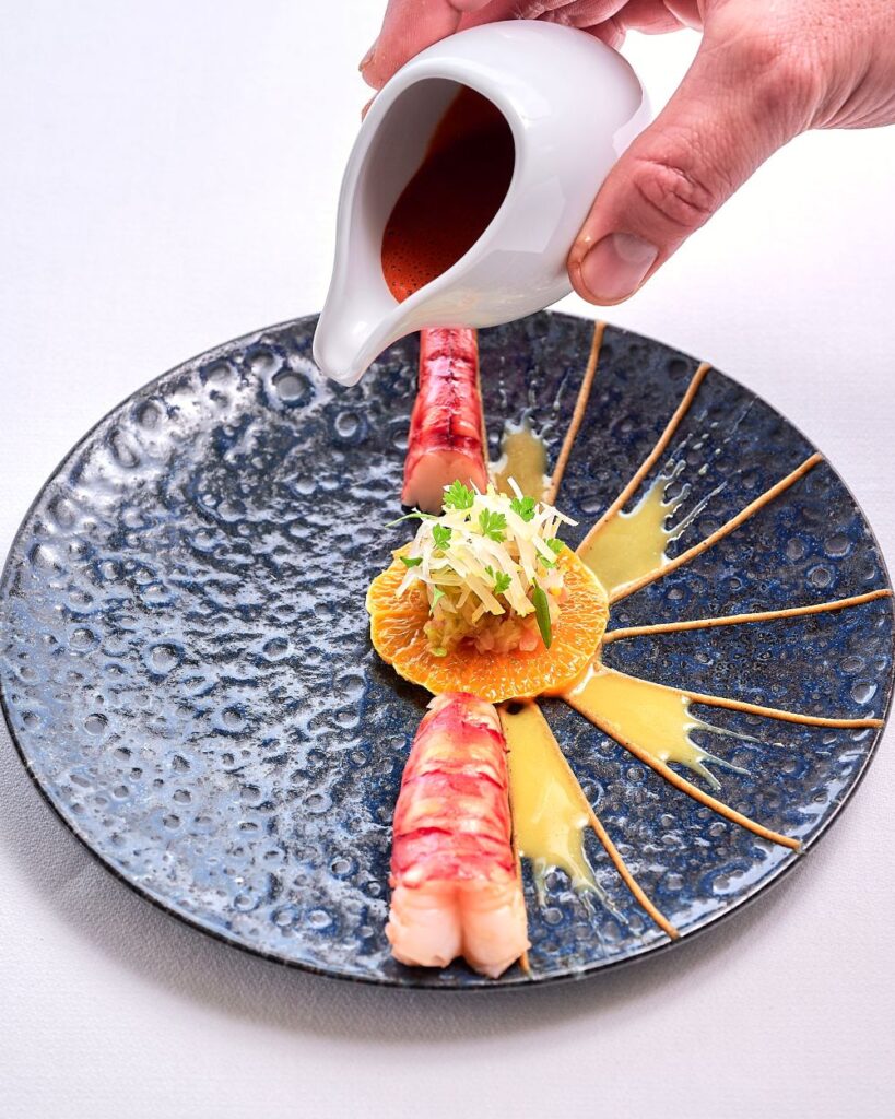Chef Gil 的招牌菜式「GOA – 果阿 Xeq Xeq 紅蝦」,深刻呈現了葡萄牙及其前殖民地之間知識與烹飪遺產的美妙交匯。透過果亞的傳統料理方式,訴說葡萄牙與印度料理如何相互影響。在這道菜式中,傳統的印度香料與葡萄牙食材如大西洋紅蝦、柑橘與椰菜相配,創造出兩種文化的交集。