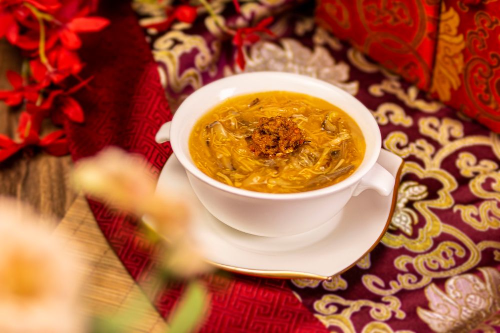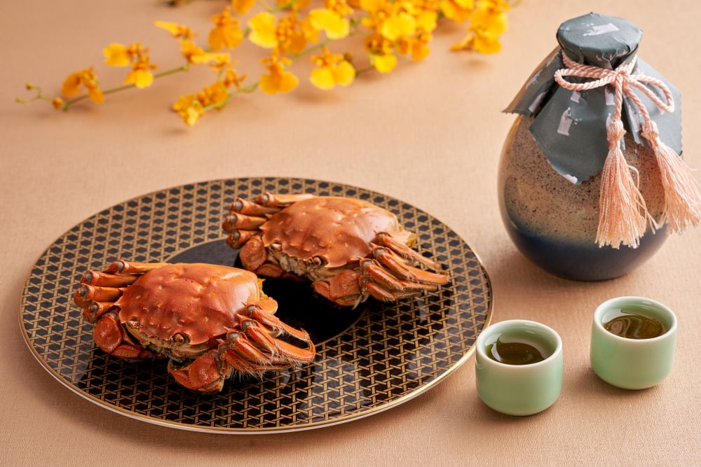 八道菜的「金秋大閘蟹盛宴」以清蒸陽澄湖大閘蟹為重頭戲,蟹殼金黃油亮,蟹膏香濃誘人,肉質細膩且鮮甜回甘。其餘馥郁芳香的菜式包括紅燒蟹粉瑤柱鴨絲羹、芝士蟹粉焗蟹蓋、蟹粉松茸扒自家製豆腐、生拆蟹粉小籠包等,每一道皆展現廚師團隊的巧手匠藝。最後以甘甜暖胃的薑茶芝麻湯圓及陳年花雕酒作結,為這場秋蟹盛宴畫上圓滿句號。