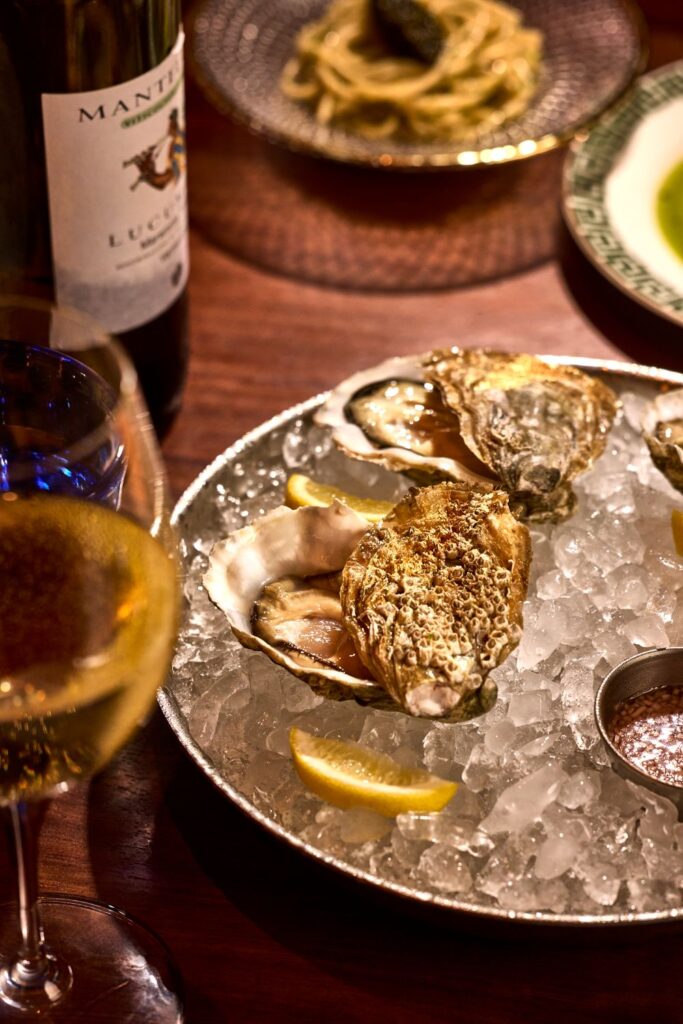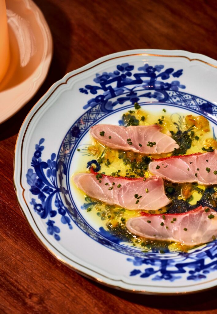盛宴以一系列小食展開,包括生蠔配紅酒醋洋蔥醬汁(Tarbouriech oyster with mignonette au Pastis)、烤釀沙丁甸魚(Grilled sardine farci “alla boîte”)、炸鷹嘴豆條配哈里薩蛋黃醬(Panisse frites with harissa mayonnaise)、鱈魚魚籽醬配法國蘿蔔和多士片(Cod tarama with French radish and toasted crouton),以及炒蜆(Clams poêlées)。刺身材式則展現出馬賽與大海的深厚連結,亮點包括充滿陽光氣息的香草及柑橘的普羅旺斯啓吞拿他他(Tuna tartare à la Provençale)。