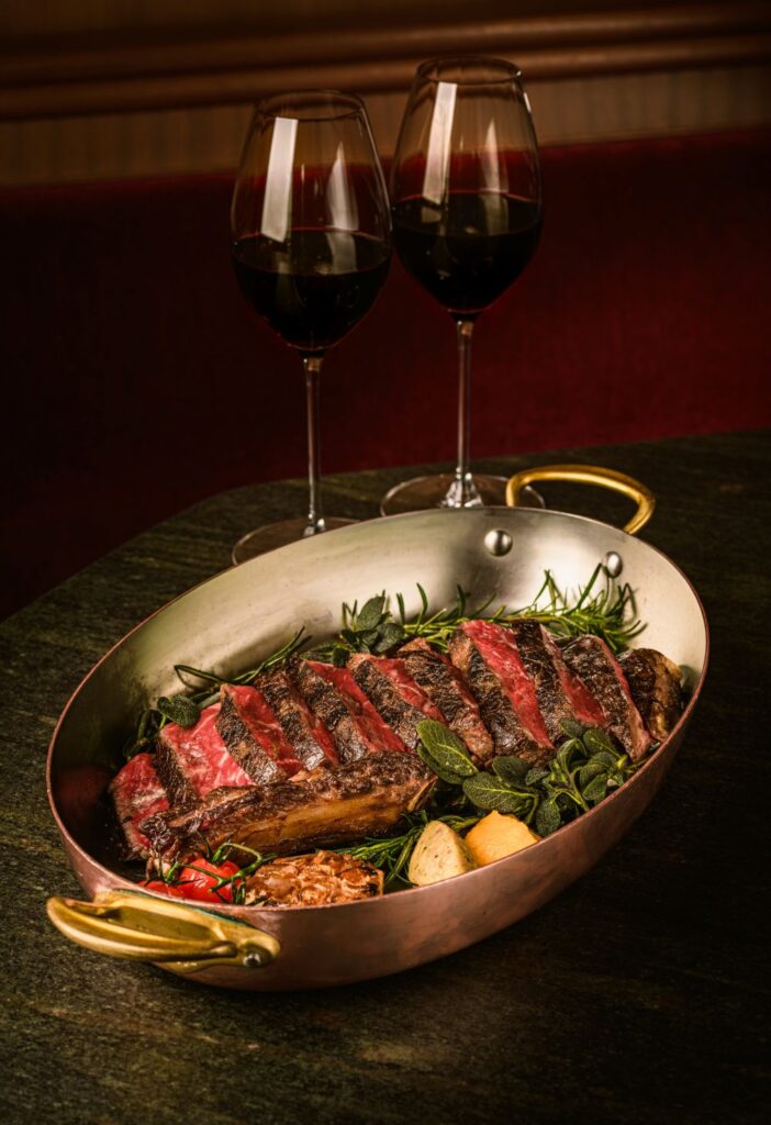 主菜方面,餐廳招牌碳烤牛扒嚴選意大利穀飼Carima 帶骨牛肋扒,牛扒先風乾 21 天,餐廳再追加 7 天風乾,使肉香與口感更臻完美,以高溫炭火封存肉汁。搭配兩款精心呈現的配菜:外脆內軟的意式玉米糕,以及滋味的鮮茄羅勒芝士燴茄子,截然不同的口感令風味更見平衡與滿足。