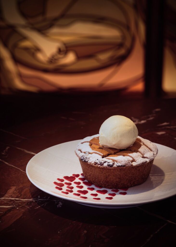 最後的甜點 — 意大利傳統櫻桃餡餅 亦別具意義。櫻桃在歐洲文化中象徵愛意,此甜品承襲中世紀的烘焙智慧,以香酥的牛油餅皮造成格子狀的餅皮,盛載自家熬製的櫻桃果醬,並佐以手工西西里橄欖油雪糕;溫暖的牛油香氣、甜潤的果香與雪糕柔滑的口感交織,帶來層次豐富而窩心的味覺享受,為情人節寫下溫暖而甜蜜的句點。
