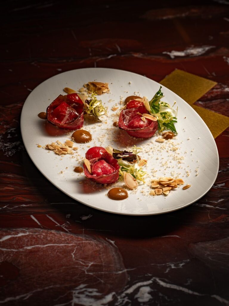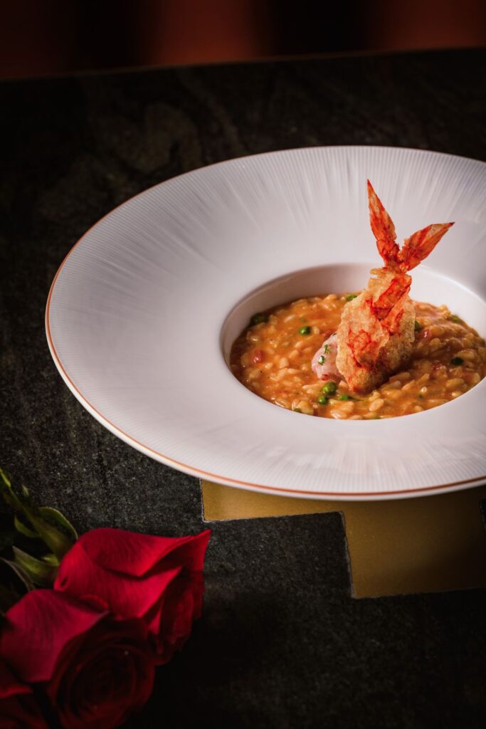 頭盤風乾牛肉麗歌塔芝士雲吞 -以牛後腿眼肉 (Beef Eye-round) 部位製作、風乾 21 天的風乾牛肉,包裹細滑的麗歌塔芝士與醃漬車厘茄,巧手塑造成紅玫瑰造型,不添加任何食用添加劑。精緻小巧,讓您一口盡享濃郁香氣與創意巧思。緊接著登場的主菜西西里紅蝦燴飯,選用整隻西西里紅蝦入饌,展現「從頭到尾」的烹調理念。