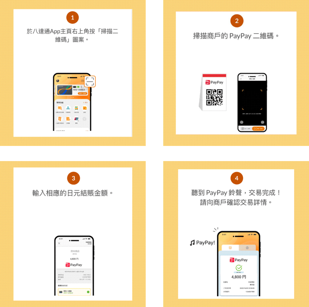 八達通成為香港第一家電子支付,全面覆蓋了「顧客掃碼支付」及「商戶掃碼收款」的PayPay數百萬商戶網絡,包括大型連鎖店及當地特色小店,讓用戶在日本可享受更便捷的支付體驗。