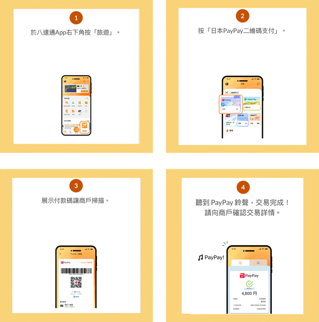 使用方法簡單,用戶只需打開八達通App,進入專為旅客設計的「旅遊專頁」,並選擇日本「PayPay」支付服務,便能選擇以手機八達通或八達通銀包輕鬆完成付款。加上八達通App支援多種充值方式,隨時隨地輕鬆增值,無需擔心餘額不足。